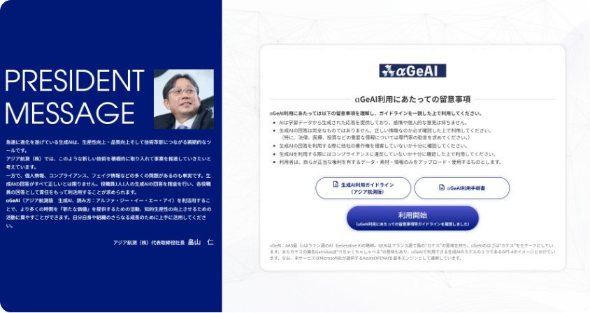 αGeAIの利用開始画面にも表示しており、常に目に触れるような仕組みにしております。